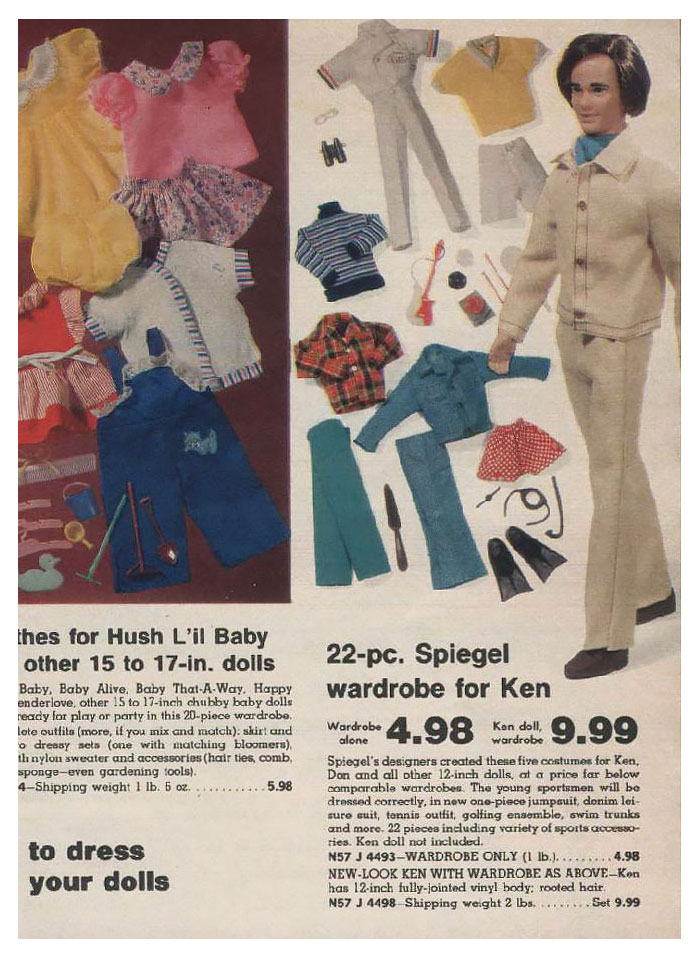 By the mid-1970s only Montgomery Ward and Sears were still selling genuine Mattel Ken clothing through the Christmas catalogues. The other stores sold their own cheaper ‘clone’ clothing, sometimes in combination with a genuine Ken, but mostly independently. There were